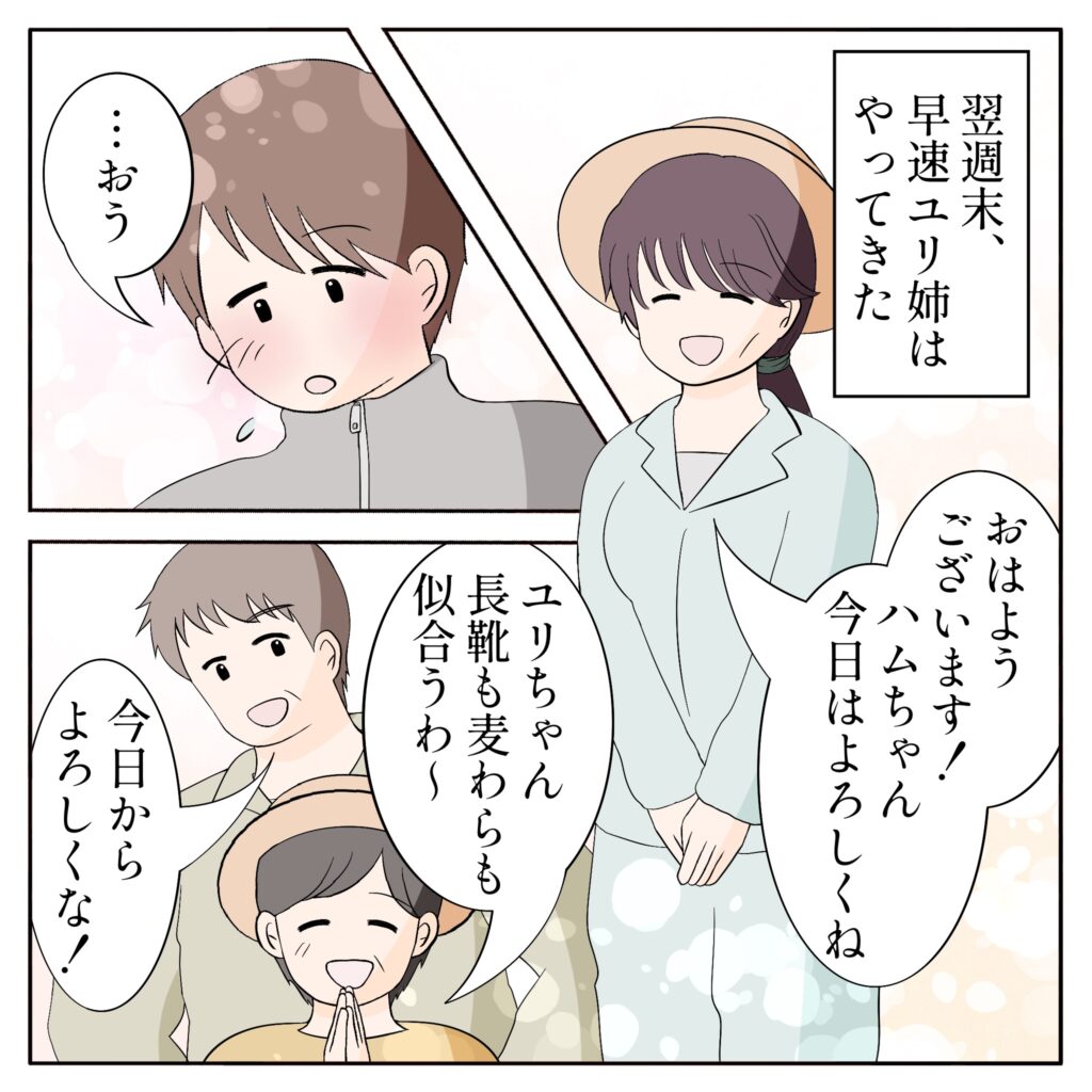 そして翌週末、ユリ姉はさっそく実家の手伝いにやってきました。「おはようございます!ハムちゃん、今日はよろしくね」作業着に麦わら帽子姿のユリ姉はいつもと少し雰囲気が違っていて、なんだか照れてしまいます。父と母もユリ姉が来てくれたのがよっぽど嬉しいのか、「ユリちゃん、長靴も麦わらも似合うわ~」といつもよりテンション高め。
