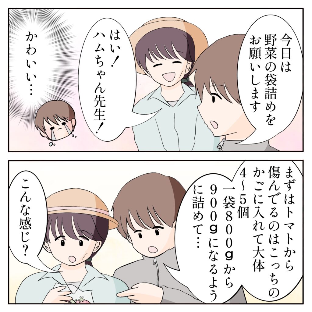 「今日は野菜の袋詰めをお願いします」俺がそう言うと、ユリ姉は「はい!ハムちゃん先生!」と元気よく返事をしました。・・・かわいい。ユリ姉をスカウトしてくれた姉ちゃんには感謝しないとな。そんな気持ちを悟られないように、平静を装いながら袋詰めの手順を一つひとつ説明します。