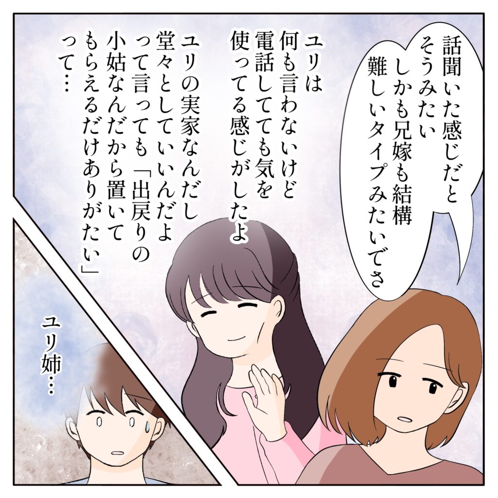 「話聞いた感じだとそうみたい、しかも兄嫁も結構難しいタイプみたいでさ・・・」ユリ姉は何も言わないけど、電話してても気を使ってる感じがしたと姉ちゃんは言います。ユリの実家なんだし堂々としてていいんだよと伝えても、「出戻りの小姑なんだから置いてもらえるだけありがたい」と控えめな姿勢を崩さなかったそうです。