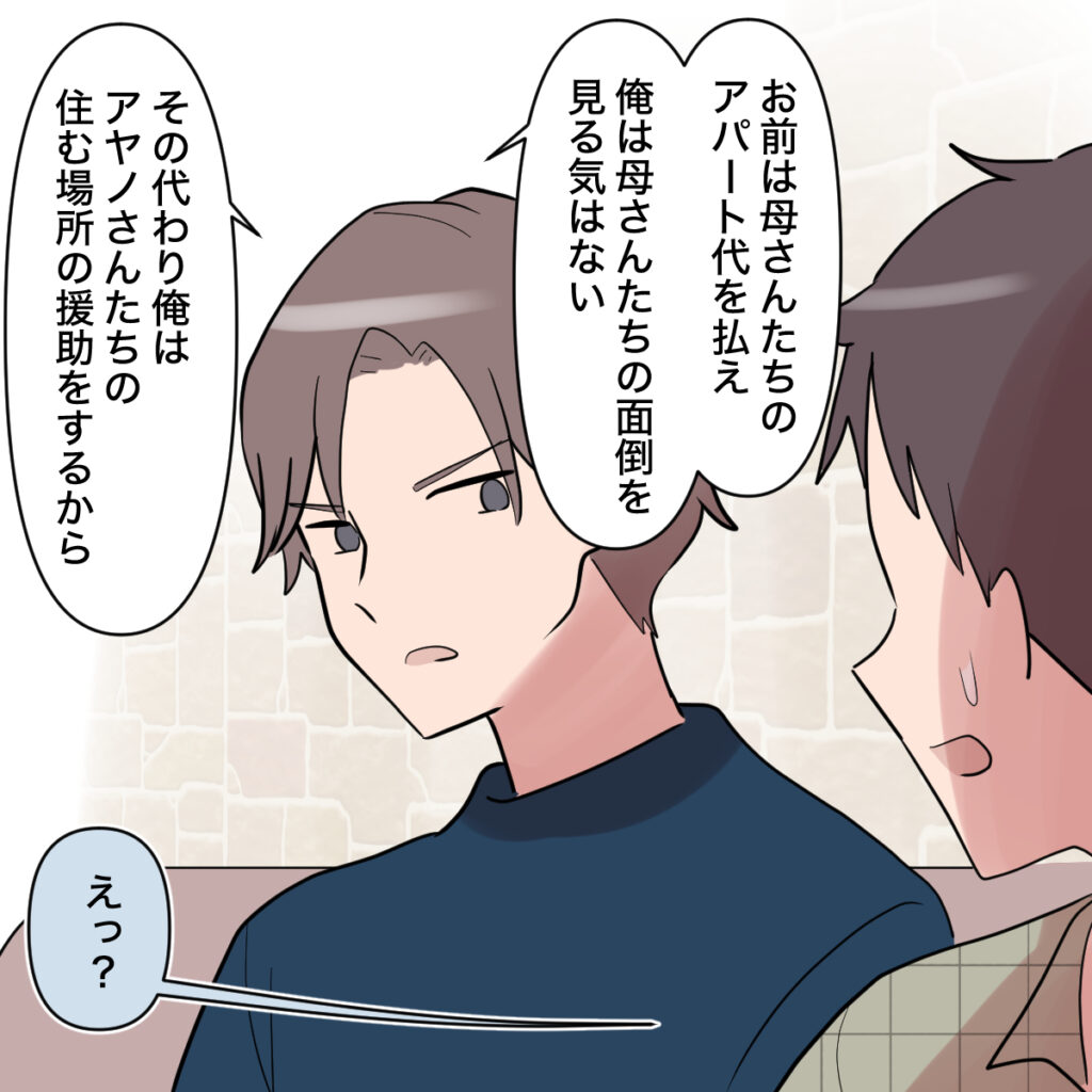 義母とキョウカさんの面倒をみる気がないとハッキリトモヤさんに伝えたナオキさんは、義母たちのアパート代をトモヤさんに払うように言い、その代わりナオキさんが私とヒマリの住む場所の援助をしてくれると宣言しました。ナオキさんの言葉を聞いたトモヤは驚いた顔をしました。