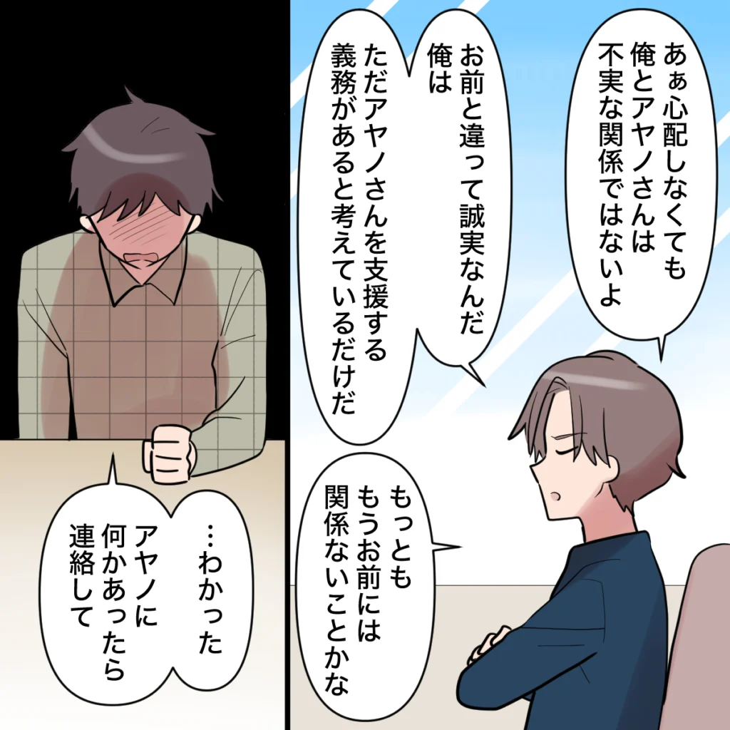 ナオキさんと私の関係を疑っているかのようなトモヤに、ナオキさんがハッキリと否定しました。「お前と違って誠実なんだ俺は。ただ、アヤノさんを支援する義務があると考えているだけだ」とナオキさんに言われ、さらに「もうお前には関係ないことかな」と言われて何も反論できないトモヤは、うつむいたまま「わかった。アヤノになにかあったら連絡して。」とだけ言いました。今まで私になにがあろうが放り出して義母とキョウカさんのもとに走って行ったトモヤに言われる筋合いはありません。