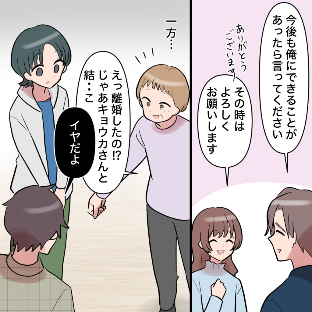 義母とキョウカさん、そして2人の言いなりになるだけのトモヤ。3人との縁を切り、目的を果たしたナオキさんと私は笑顔でその場を後にしました。一方、トモヤは義母たちの待つ家に帰ると、うなだれたまま私と離婚したことを報告しました。すると義母もキョウカさんも「えっ離婚したの!?」と表情を明るくして、キョウカさんと結婚すればよいとトモヤに伝えようとすると、言葉を遮ってトモヤは「イヤだよ」とハッキリ拒否しました。