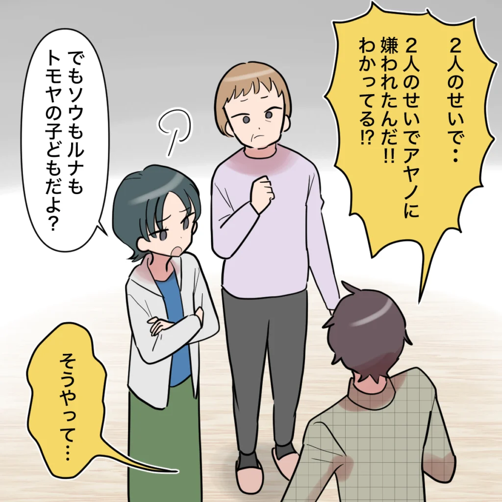 アヤノさんと離婚したのならキョウカさんと結婚すればよいと当然のように言う義母に、トモヤさんは2人のせいでアヤノさんに嫌われたのだと責めました。ところが義母もキョウカさんも、ソウくんとルナちゃんはトモヤさんの子どもなのだから、トモヤさんが面倒をみるのは当然という態度を変えず、話が通じません。