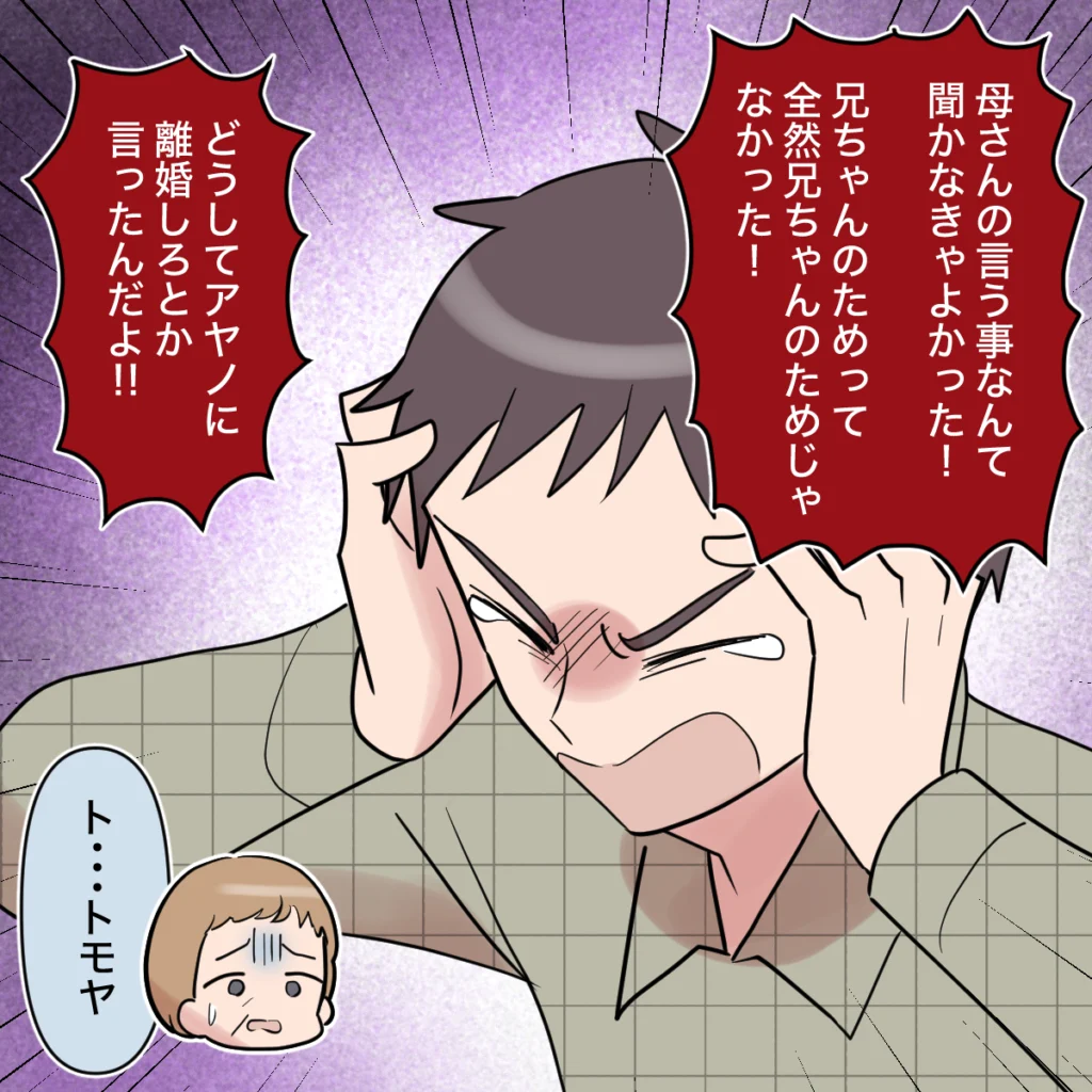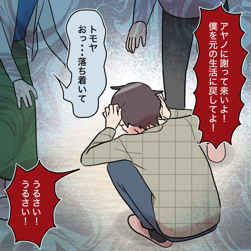 だんだんパニック状態になっていったトモヤさんですが、もはやどうすることもできません。「アヤノに謝って来いよ!僕をもとの生活に戻してよ!」と、叶うはずもないことを言いながら座り込んでしまいました。「トモヤの子どもなんだから」と当然のように構えていた義母とキョウカさんも、トモヤさんの様子を見てさすがに少し慌てて「トモヤ落ち着いて」となだめようとしましたが、もうトモヤさんは2人の言うことを聞く気がありませんでした。