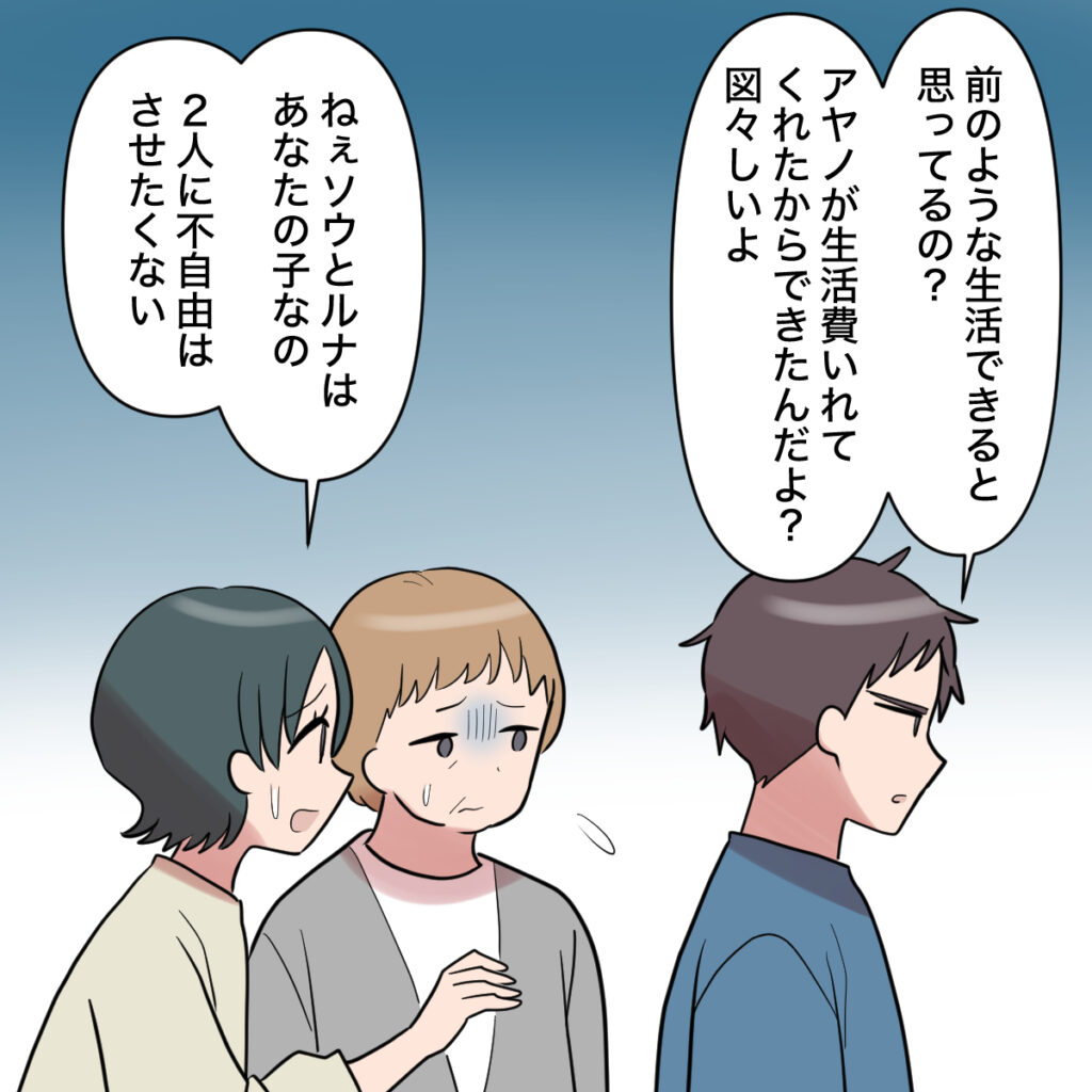 今までトモヤさんがはっきり断れない理由だった、ソウくんとルナちゃんがトモヤさんの子であることを持ち出してキョウカさんも家にお金を入れてくれるようにお願いしますが、トモヤさんは無表情を崩さず「前のような生活できると思ってるの?アヤノが生活費入れてくれたからできたんだよ?図々しいよ」と目も合わせずに言い放つのみ。以前のような流されやすい、扱いやすいトモヤさんではなくなったので義母もキョウカさんも慌て始めていました。