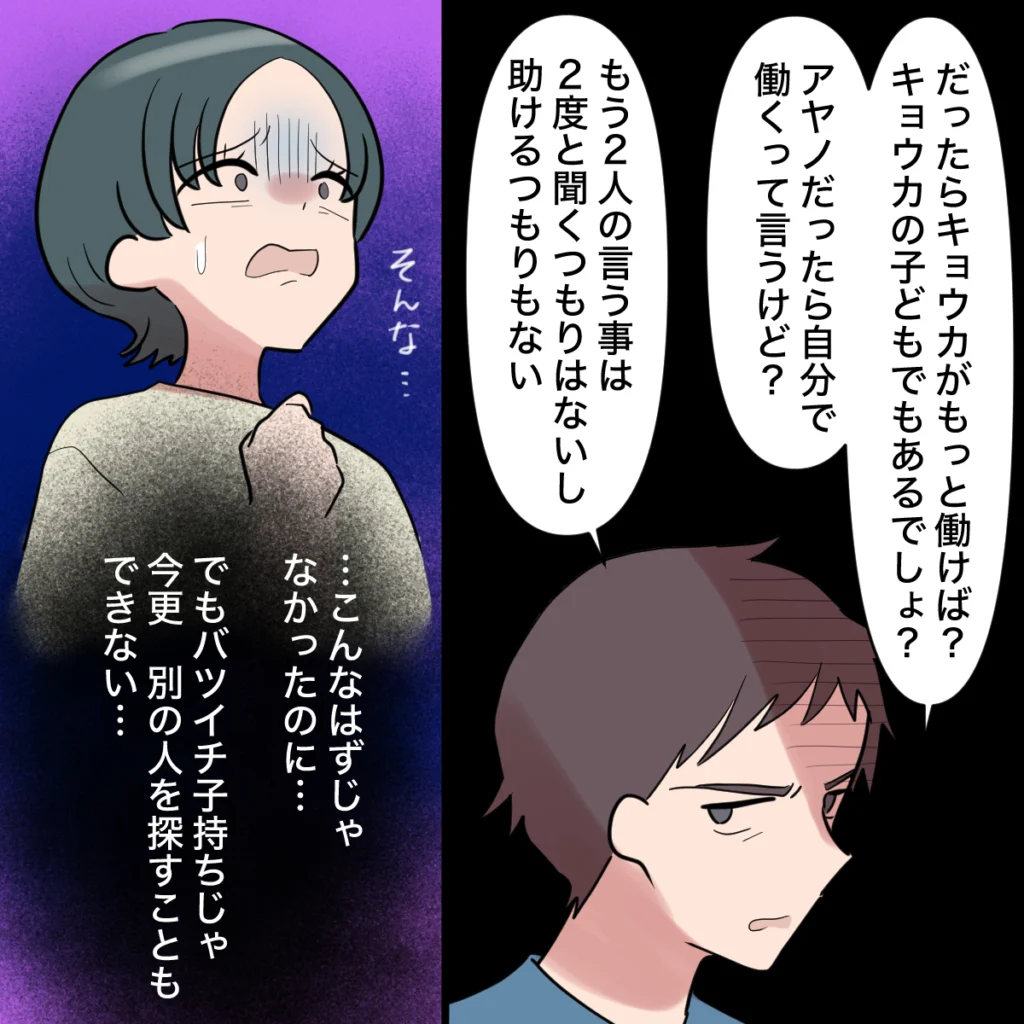 トモヤさんに「もっと働けば?アヤノだったら自分で働くって言うけど?」と冷たく言い放たれたキョウカさんは、こんなはずじゃなかったと奈落の底に突き落とされた気持ちになるのでした。稼ぎが良かったナオキさんと結婚し、依存して何の苦労もない生活を手に入れて満足だったキョウカさんは、ナオキさんとの間には子どもができないとわかると将来の自分の生活の保険として弟のトモヤさんとの間に子どもを作っておけばよいと考えました。万が一バレても不倫ではないし、最悪寄生する先が変わるだけ、と安易に考えていたキョウカさんの目論見が外れたのです。バツイチで子どもが2人いるキョウカさんは、別の人を探すこともできないと青ざめました。
