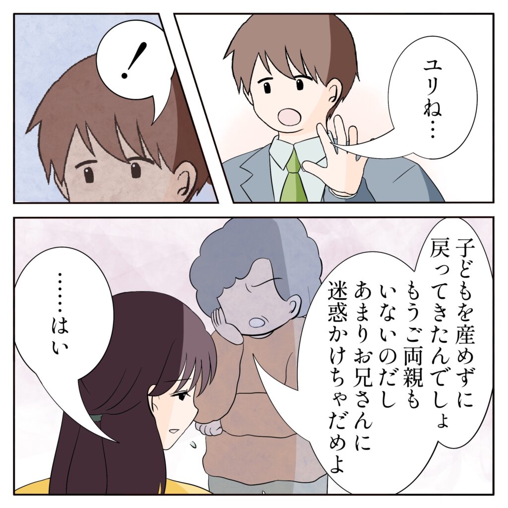 声をかけようとした瞬間。ユリ姉が近所のおばさんから、「子どもを産めずに戻ってきたんでしょ、もうご両親もいないのだし、あまりお兄さんに迷惑かけちゃだめよ」と責められているのを耳にしてしまいました。ユリ姉は小さく「・・・はい」と頷きます。
