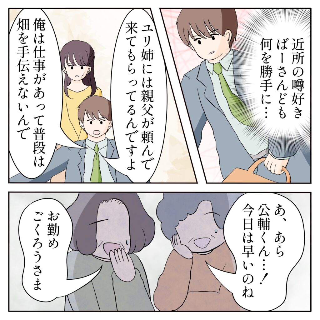 俺はいてもたってもいられず、ユリ姉をかばうようにおばさんたちの前に立ちました。「ユリ姉には親父が頼んで来てもらってるんですよ、俺は仕事があって普段は畑を手伝えないんで」俺が突然現れたことに焦ったのか、おばさんたちは「あ、あら公輔くん!今日は早いのね」「お勤めごくろうさま」と不自然に取り繕います。