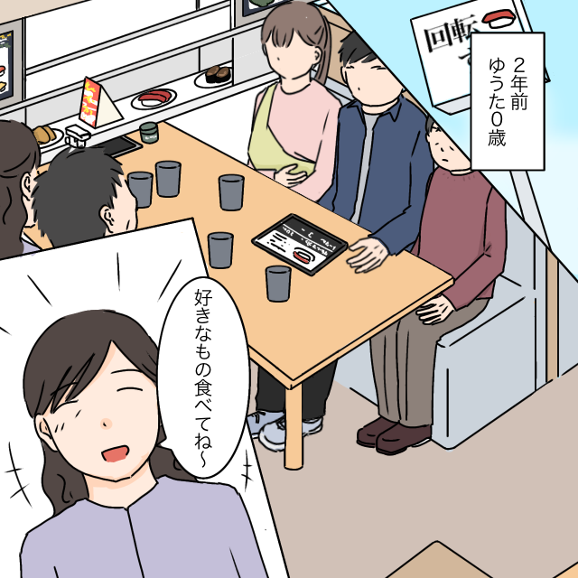 あれは2年前にみんなで回転ずしに行ったときのことです。ゆうたはまだ0歳でした。席につくと「好きなもの食べてね~」と義母が笑顔で言ってくれ、義家族との外食にまだ慣れていない私を気遣ってくれる義母の優しさを感じていました。