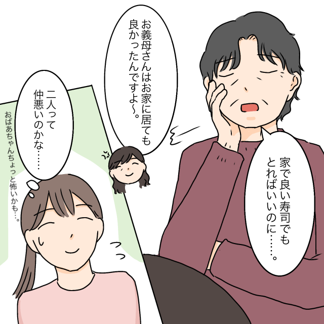 すると、「家で良い寿司でもとればいいのに・・」とため息まじりに義祖母がボソッと言いました。すかさず「お義母さんはお家に居ても良かったんですよ~」と怒りのこもった笑顔で言い返す義母を見て「二人って仲悪いのかな・・。おばあちゃん、ちょっと怖いかも・・」と思ったのを覚えています。