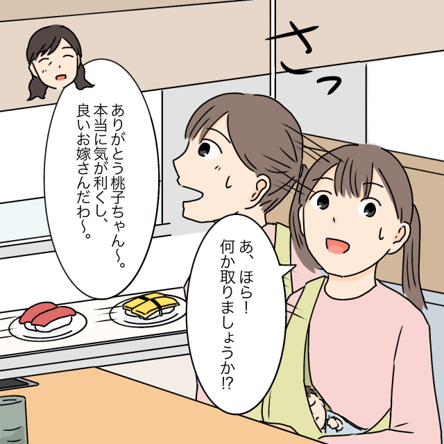 私は気まずい空気に耐えられず「あ、ほら!何か取りましょうか!?」と聞くと「ありがとう桃子ちゃん~。本当に気が利くし、良いお嫁さんだわ~」と義母がにこにこしながら言ってくれました。