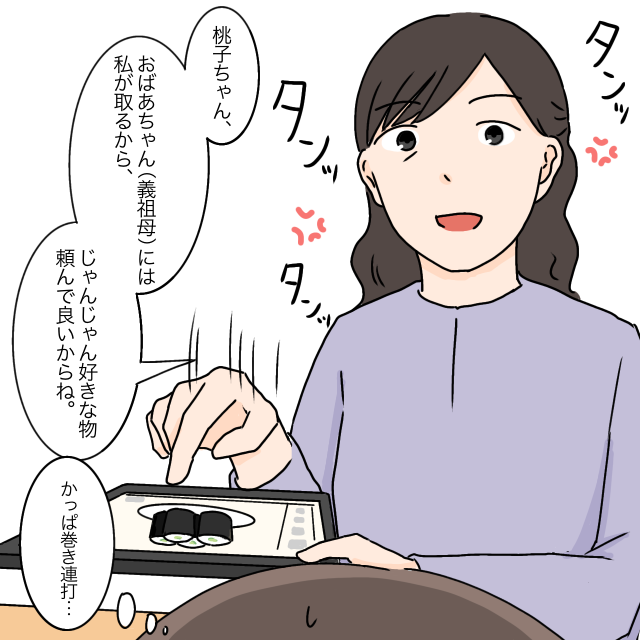 この時、義母は何も言い返しませんでしたが、「桃子ちゃん、おばあちゃんには私が取るから、じゃんじゃん好きな物頼んで良いからね」と言いながら、タッチパネルでかっぱ巻きを連打していました。あのかっぱ巻きっておばあちゃん用だよね・・。静かに仕返しをする義母を見て、2人の間にはただならぬものがあると感じました。