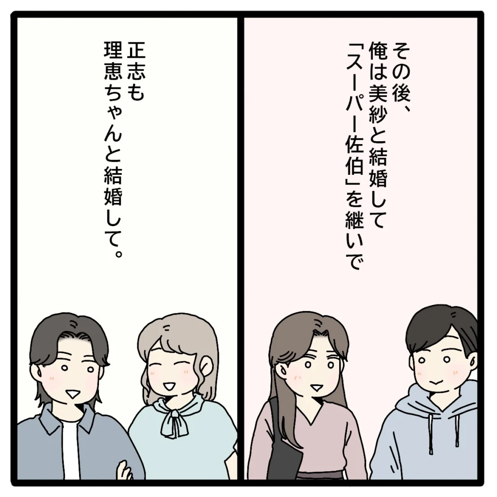 その後、裕二さんは美沙ちゃんと結婚して『スーパー佐伯』を継ぎ、正志は私と結婚しました。その頃には正志はすでに地元を離れており、自分が地元で話題になっていることも知らないまま日々を過ごしていました。