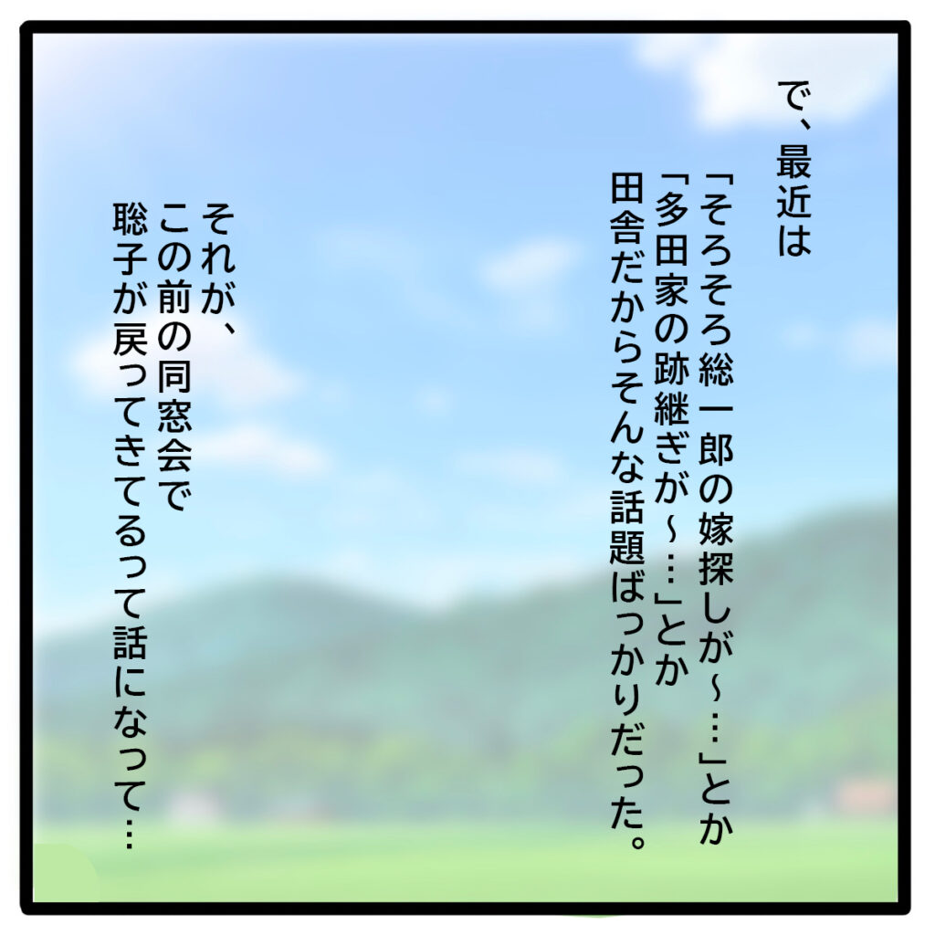 その後は、正志の地元の同級生たちも結婚や出産を経て生活がひと段落し、次第に新しい話題が少なくなっていきました。そのような背景もあり、最近はもっぱら総一郎さんの嫁探しや多田家の後継ぎ問題といった話題ばかりだったそうです。そんなとき、同窓会の席で「聡子さんが離婚して地元に戻ってきた」という話が持ち上がりました。
