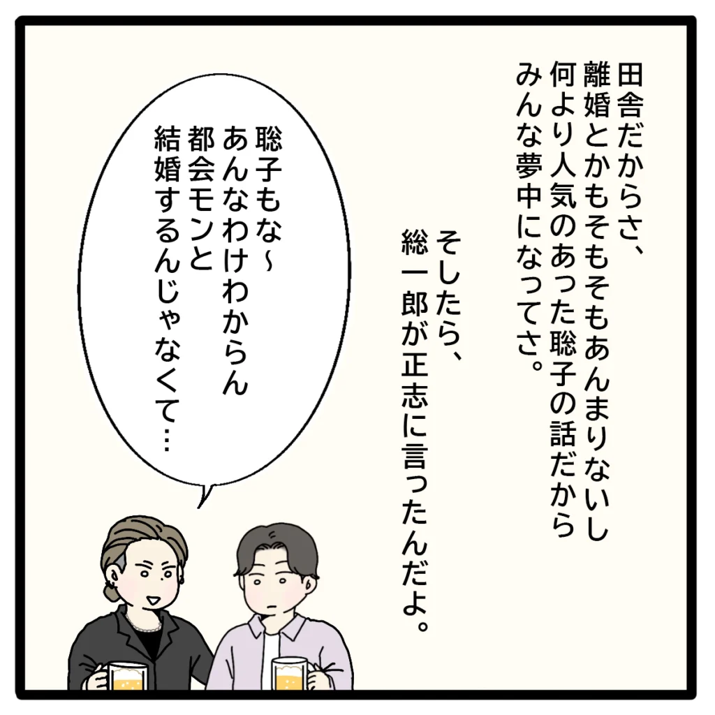 田舎という土地柄もあり、離婚はそれだけで珍しい話題。何より昔からアイドル的存在として注目を集めてきた聡子さんの話だったため、みんな一気に引き込まれたそうです。すると、その話を隣で聞いていた正志に向かって、総一郎さんがぽつりと言いました。「聡子もな、あんなわけわからん都会モンと結婚するんじゃなくて・・・」