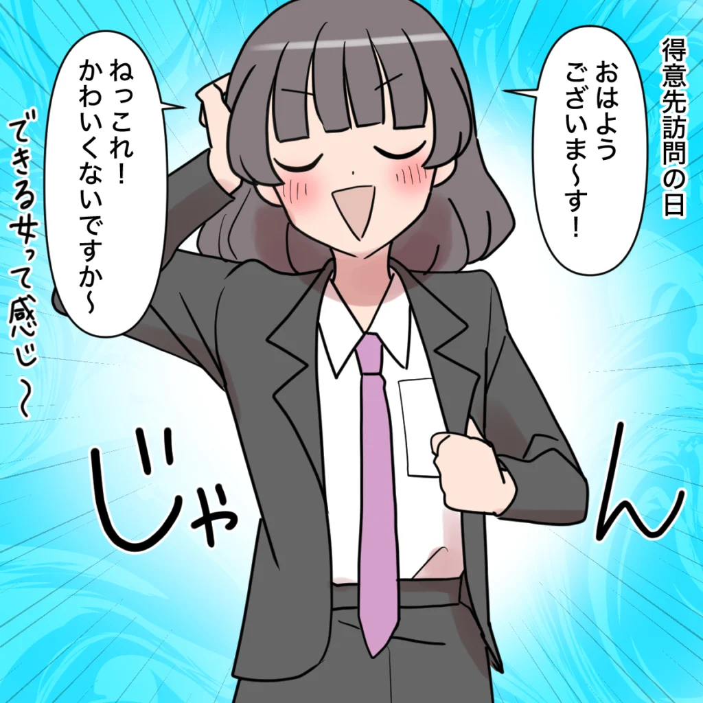 今日は私の得意先へ訪問する日。山本部長の指示で、田中さんにも同行してもらう予定です。ですが「おはようございま~す!」と出勤してきた彼女の姿を見て、私は開いた口が塞がりませんでした。なんと、ネクタイをしてきたのです。しかも、本人は「ねっこれかわいくないですか?できる女って感じ~」と自慢げ。