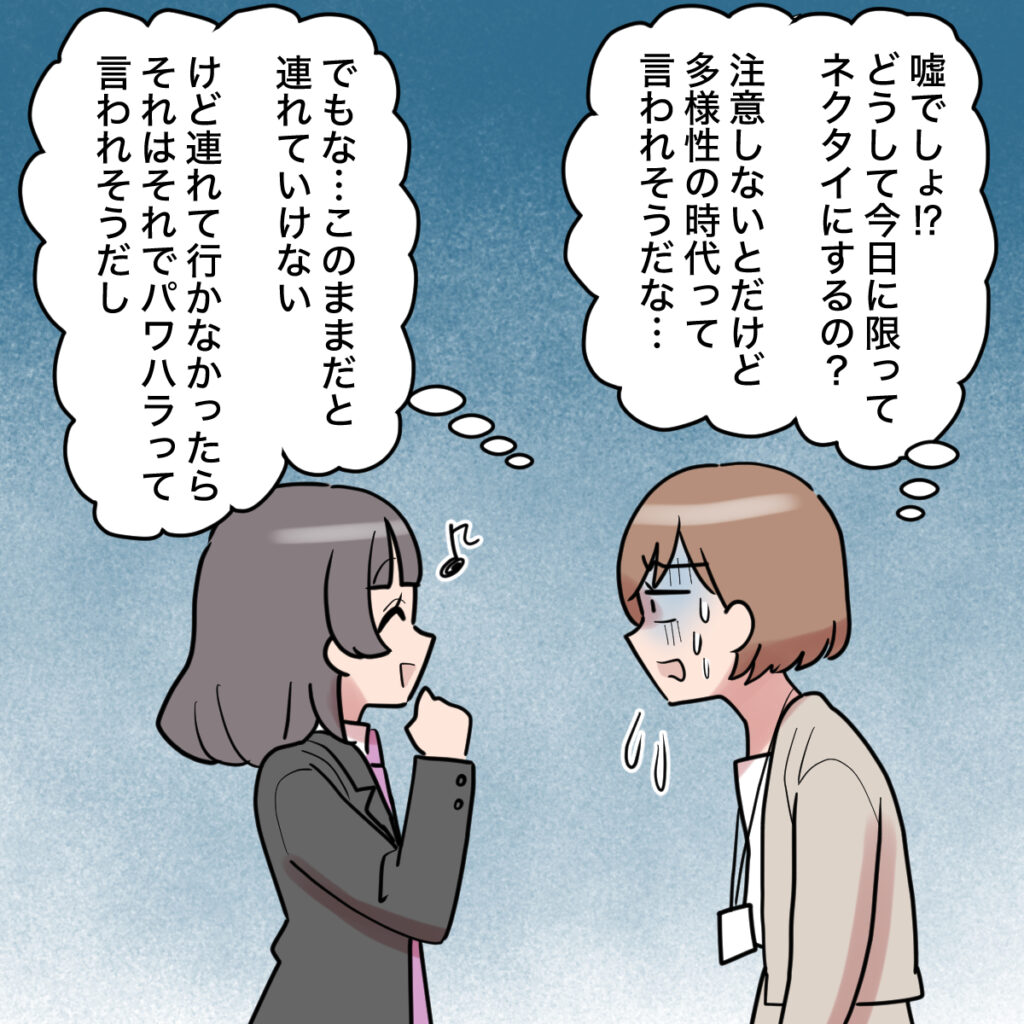 どうして今日に限ってネクタイをしてくるの?田中さんの規格外な行動に、私は顔を青ざめます。教育係の立場としては注意しないといけないけど、「多様性の時代」って言われそうだし・・・。でもこのままではとても連れていけない。だけど連れて行かなかったらパワハラって言われそう。私はそんなことを考えながら、必死で言葉を探しました。