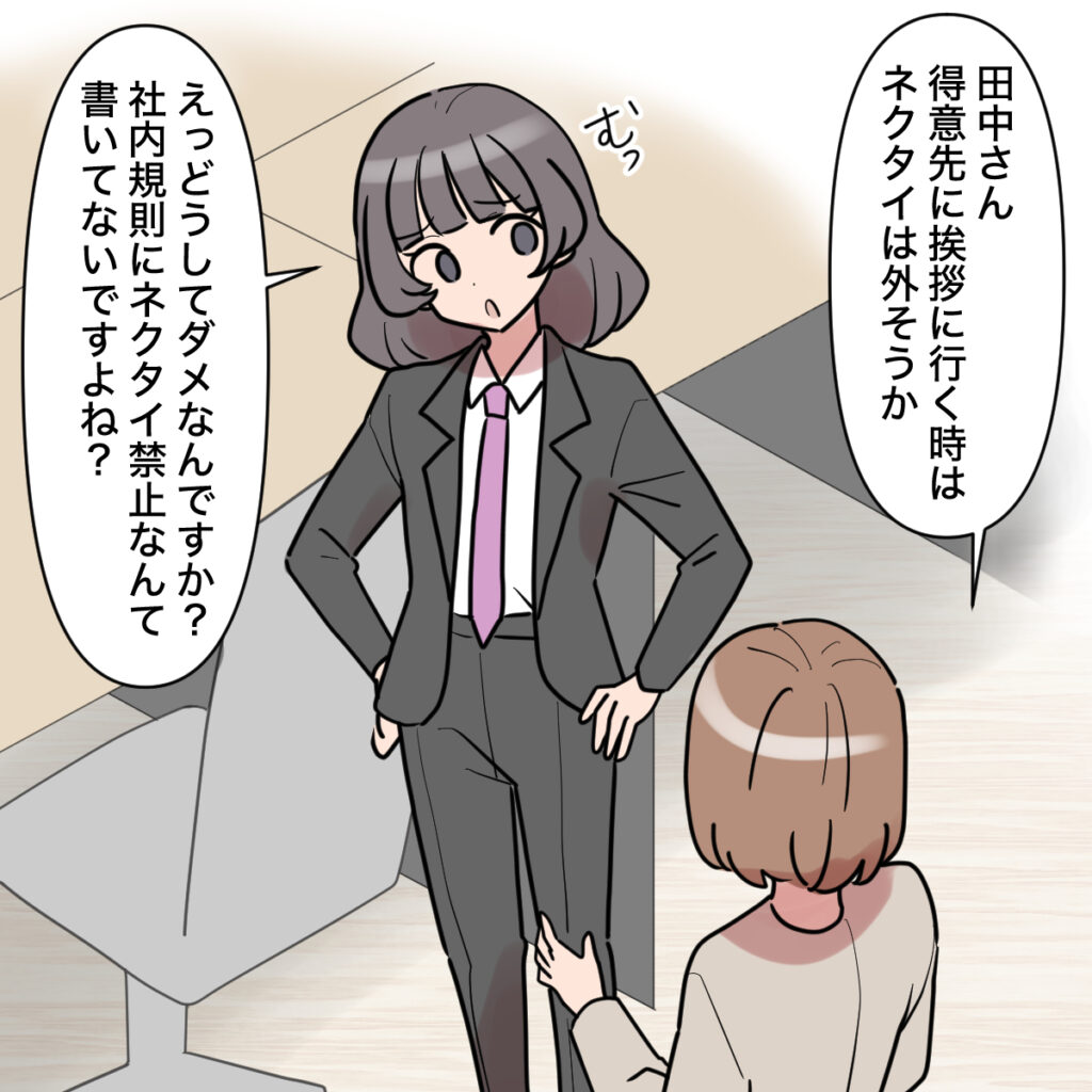 「田中さん、得意先に挨拶に行くときはネクタイ外そうか」私は、田中さんを刺激しないように優しく声をかけました。しかし、そんな言葉で彼女を説得できるはずありません。田中さんはムッとした顔で「どうしてダメなんですか?社内規則にネクタイ禁止なんて書いてないですよね?」と斜め上の返答をしました。