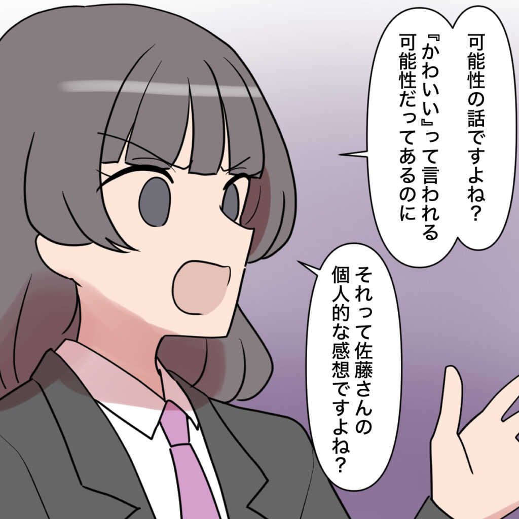 しかし、私の想いは虚しくも田中さんには届きませんでした。「可能性の話ですよね?『かわいい』って言われる可能性だってあるのに、それって佐藤さんの個人的な感想ですよね?」と屁理屈を並べるばかり。あまりの話の通じなさに、私は頭を抱えたくなりました。