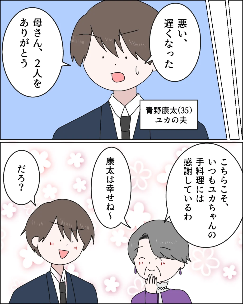 しばらくして康太が到着。「悪い、遅くなった。母さん、2人をありがとう」とお礼を言う康太に、「こちらこそ、いつもユカちゃんの手料理には感謝しているわ。康太は幸せね~」と義母が言い、「だろ?」と笑顔で返す康太。そんな2人のやり取りに私はほっこり。