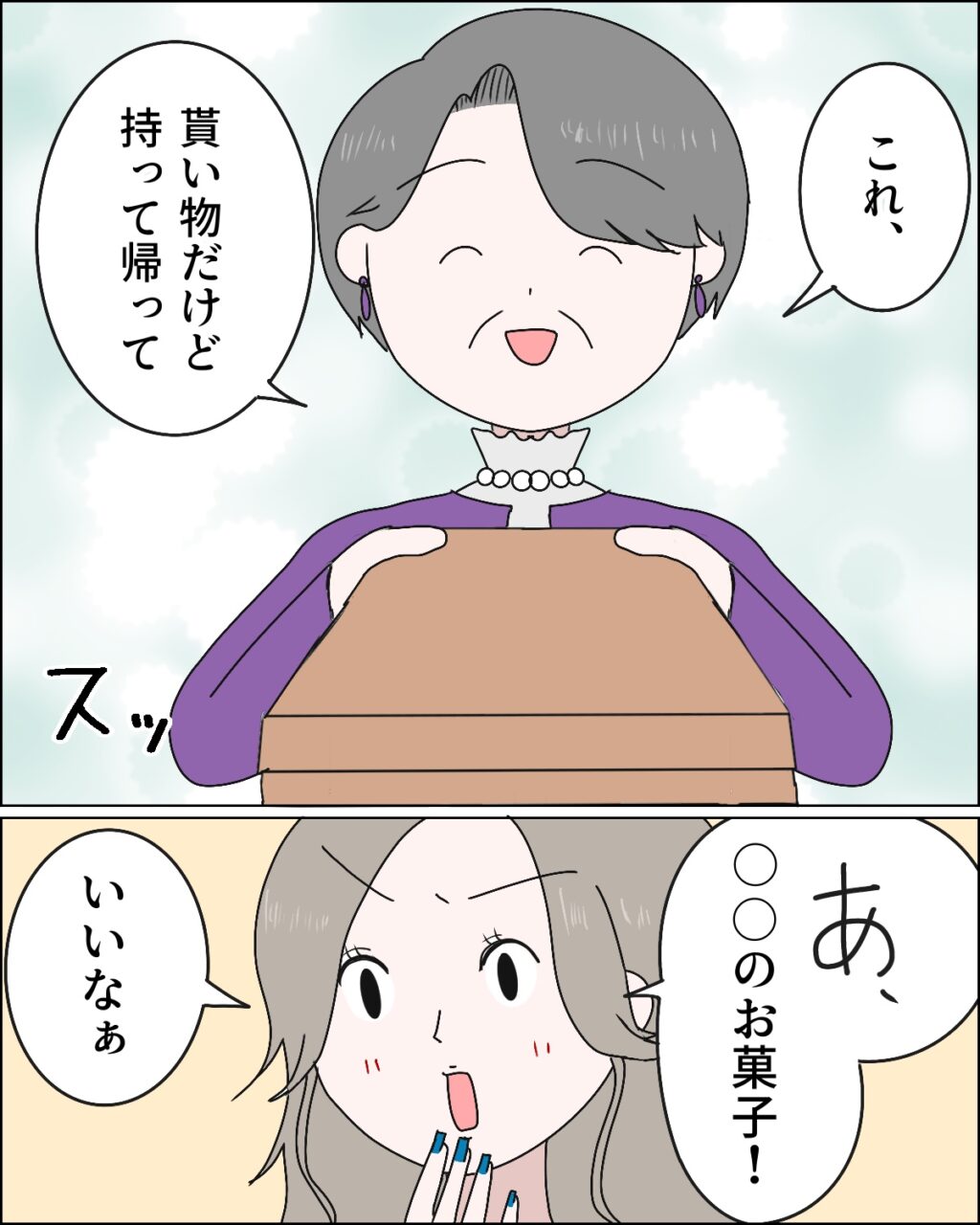 帰り際、「これ、貰い物だけど持って帰って」と義母が私たちに渡してくれた箱を見て、すかさず麻里さんが「あ、〇〇のお菓子!」と反応。義母がくれたのは有名店の高級なお菓子でした。「いいなぁ」と義母に聞こえるように言う麻里さん。