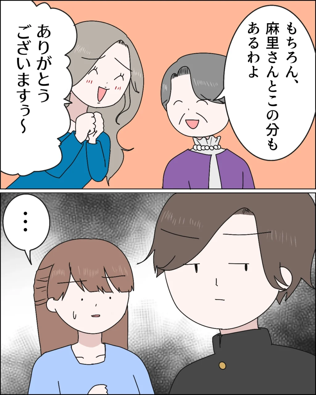 「もちろん、麻里さんとこの分もあるわよ」と義母が笑顔で言うと「ありがとうございますぅ~」と喜ぶ麻里さん。そんな麻里さんを冷めきった目で見つめるユウトくんに気づいた私は何とも言えない気持ちになりました。そりゃあ自分の母親が露骨におばあちゃんに媚を売っている姿なんて見たくないよね。