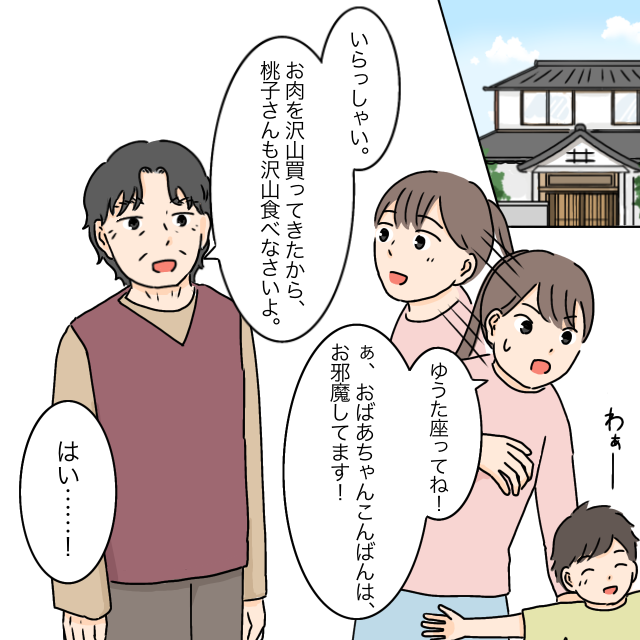 そう遠くはない義実家。私たちは家族ですぐに向かいました。義祖母が笑顔で「お肉をたくさん買ってきたから、桃子さんもたくさん食べなさいよ。」と迎えてくれました。ゆうたも嬉しそうです。