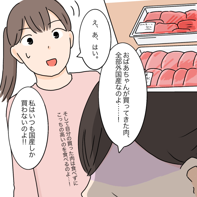 義祖母が買ってきたお肉が全て国産の肉ではないことに義母は不満なようでした。義母はお肉は少し高くても国産とこだわりを持っているのだそうです。それなのに義祖母は安い方のお肉を選んで買ってくるにもかかわらず、義母が買った高いお肉を食べるのだと文句を言いました。今考えると怒りの理由がかわいくて微笑ましい気もしますが、当事者にとっては毎度のことで腹が立つのでしょう。