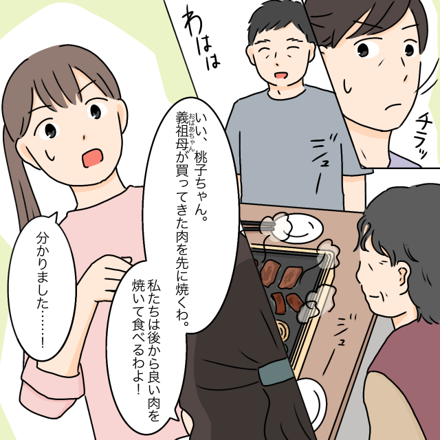 お肉のこだわりは譲れないようですね。後からしっかりおいしいお肉を食べられるなら、ここは義母に従った方が良さそうです。家族で楽しい焼肉パーティー!とはいかなそうですね。