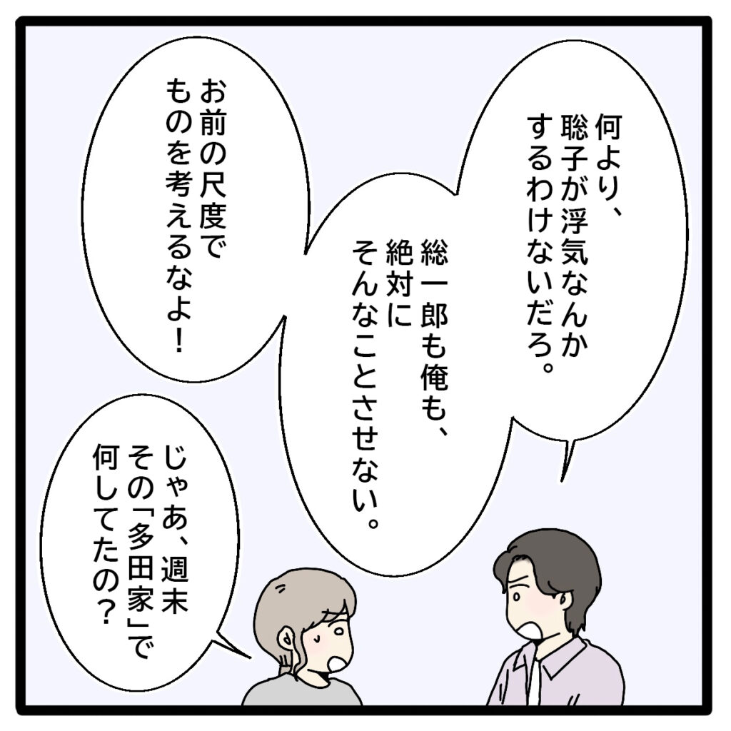 正志は私をにらみながら続けます。「何より、聡子が浮気なんかするわけないだろ!総一郎も俺も、絶対にそんなことさせない・・・お前の尺度でものを考えるなよ!」総一郎の言い分に、私は混乱しました。浮気じゃないなら、聡子さんとの関係は一体何だって言うの?私は正志に「じゃあ週末、その『多田家』で何をしてたの?」と問いかけました。