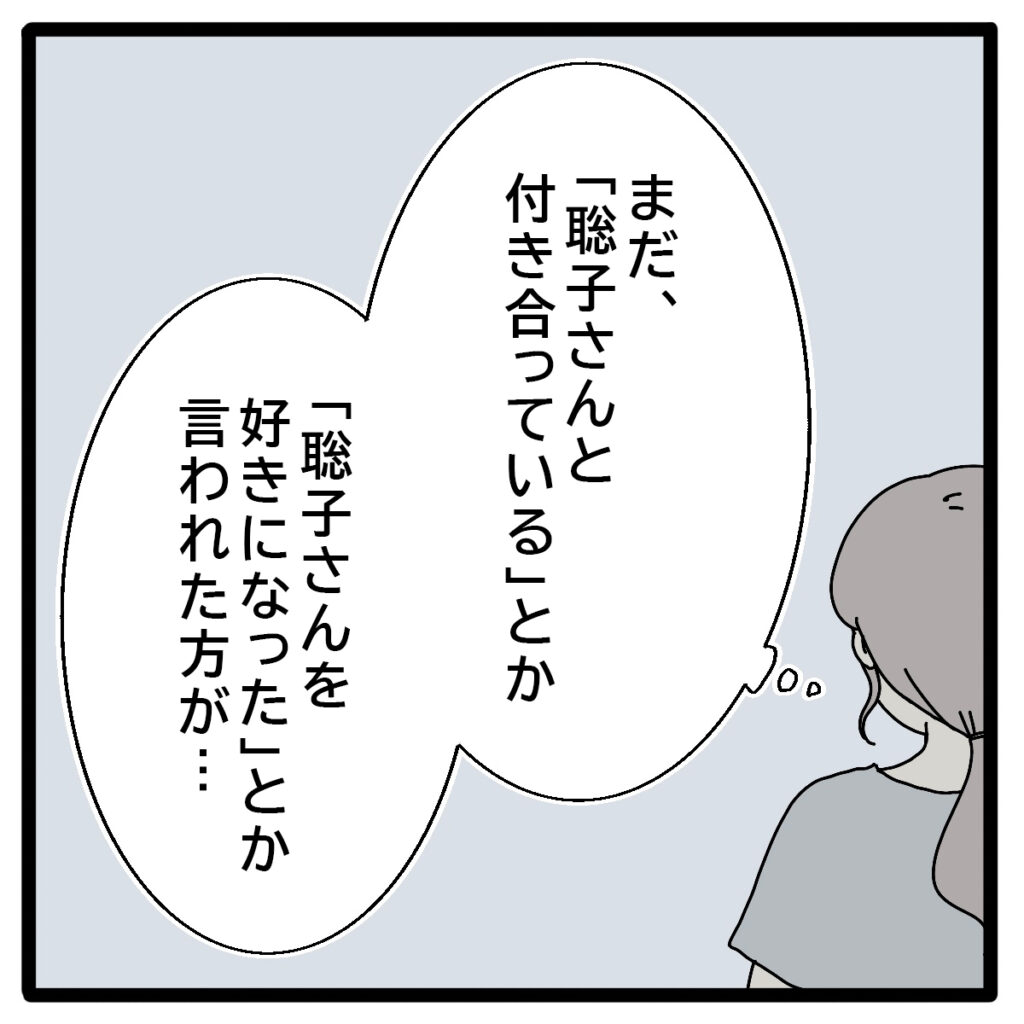 学生時代に遠くから眺めていただけの初恋の人が、ずっと苦楽を共にしてきた家族よりも大切な存在になってしまうなんて・・・。正志さんの気持ちは、どうしても理解しがたいものがあります。理恵さんの言う通り、いっそ「聡子さんを好きになった」と言われた方が、まだ心のダメージは少なかったのかもしれませんね。