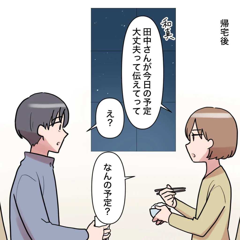「和真、田中さんが、『今日の予定大丈夫』って伝えてって」と伝えると、「え?」と驚いた顔をする和真に、「なんの予定?」と聞きました。