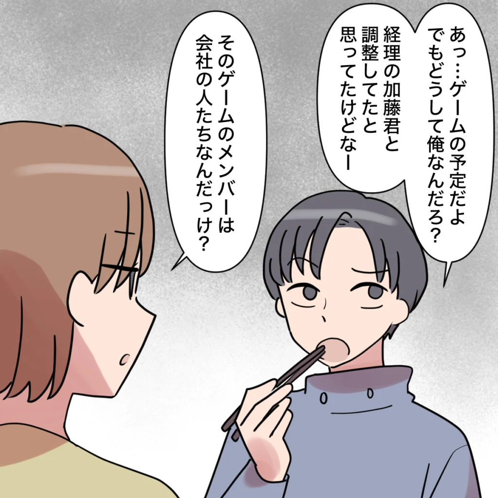 「あっ・・ゲームの予定だよ。でもどうして俺なんだろ?経理の加藤君と調整してたと思ってたけどなー」と頭を傾げる和真に、「そのゲームのメンバーは会社の人たちなんだっけ?」とたずねると、