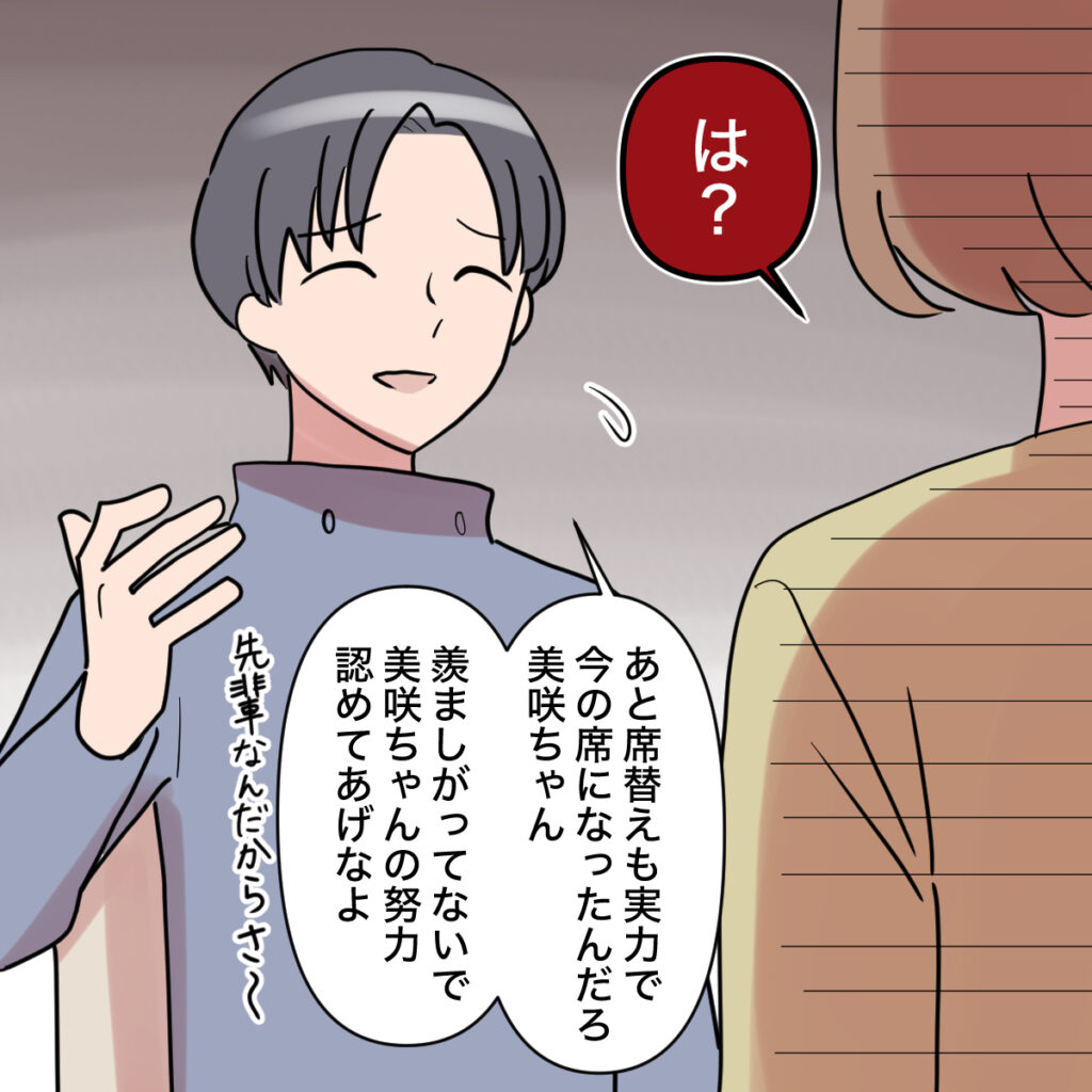 「は?」と言いながら固まる私。「あと席替えも実力で今の席になったんだろ、美咲ちゃん。羨ましがってないで、美咲ちゃんの努力認めてあげなよ。先輩なんだからさ~」和真が話すことは全部逆。田中さんが和真や他の人たちに、私が悪者のように話していること、それを和真もすっかり信じていることを知り、愕然としてしまいました。