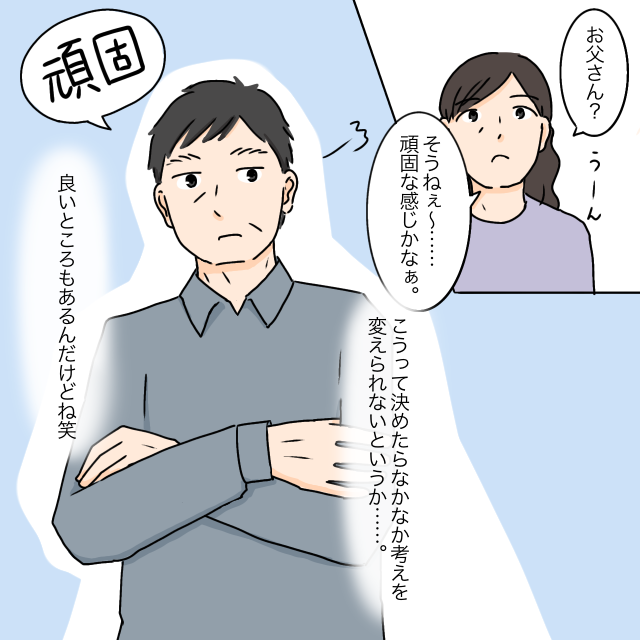 すると義母はうーんと考え込み、「そうねぇ・・・頑固な感じかなぁ、こうって決めたらなかなか考えを変えられないというか・・・」と言葉を選ぶように言いました。そして少し間を置いて、「良いところもあるんだけどね」と付け加えます。