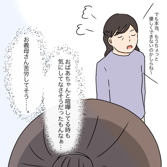 無関心な義父と、ことあるごとに喧嘩を吹っかけてくる義祖母。きっと義母は、誰にも庇われることなく、ずっと耐えてきたのではないでしょうか。せめて義母と義祖母の関係が、ほんの少しでも和らいでくれたらいいのですが。