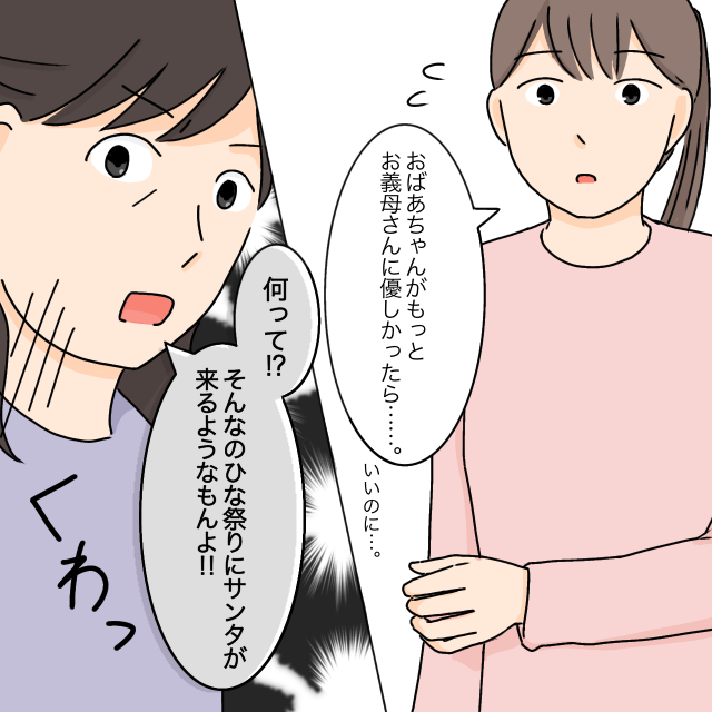 「おばあちゃんがもっとお義母さんに優しかったらいいのに・・・」私が、ふと思ったことをぽつりと口にすると、義母がものすごい剣幕で「何って!?そんなの、ひな祭りにサンタが来るようなもんよ!」ときっぱり否定しました。