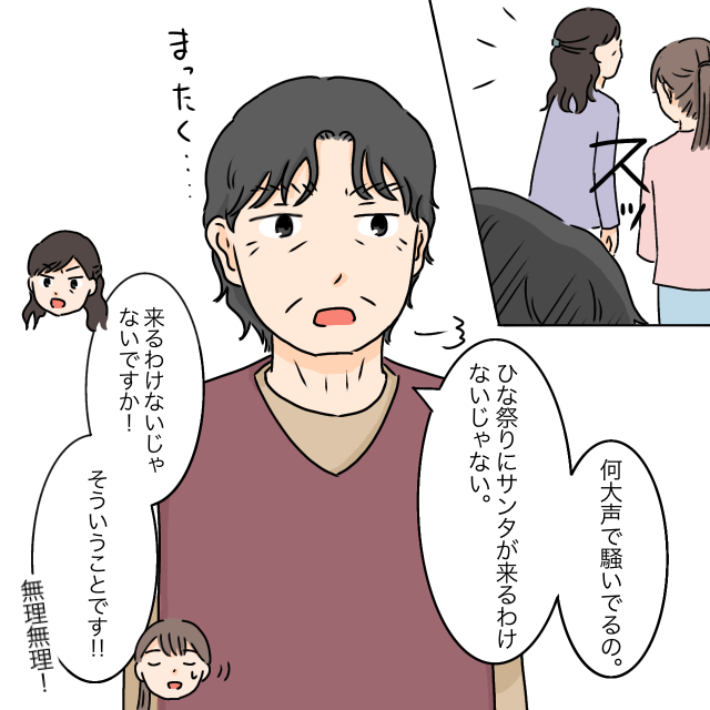 すると、義母の声につられて義祖母がやってきました。「なに大声で騒いでるの、ひな祭りにサンタが来るわけないじゃない」そう言われると、義母は間髪入れずに「来るわけないじゃないですか!そういうことです!」と言い返します。・・・やっぱり、義母と義祖母が仲良くなる日はまだまだ遠そう。