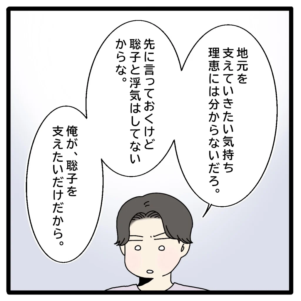 私の考えていることがわかったのか、「地元を支えていきたいって気持ち、理恵には分からないだろ。先に言っておくけど、聡子と浮気はしてないからな。俺が、聡子を支えたいだけだから」と改めて浮気を否定する正志。