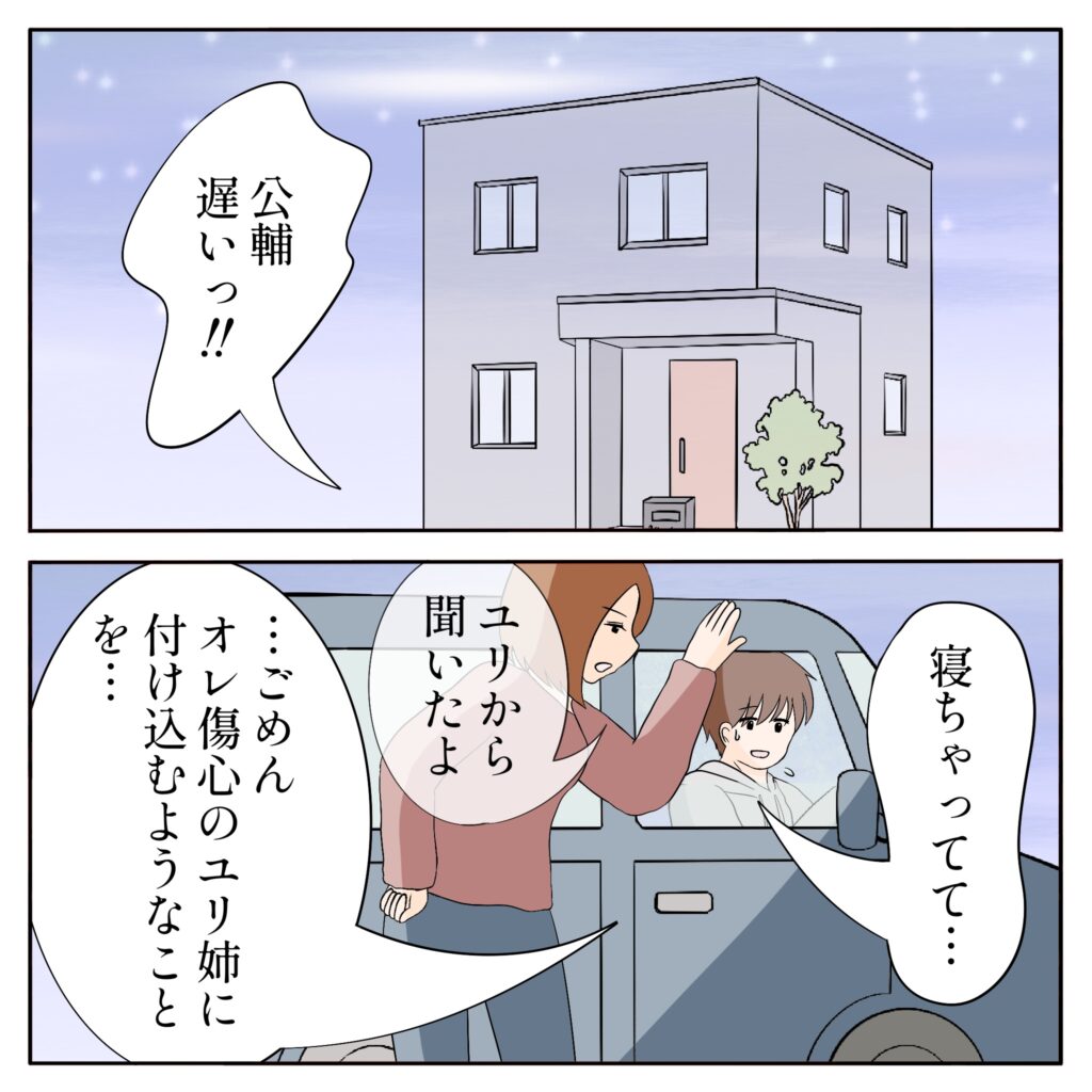 急いで姉ちゃんの家にやってきたものの、時刻はすっかり夜遅く。到着するなり、「公輔遅いっ!」と叱られてしまいました。「寝ちゃってて」そう答えると、姉ちゃんは真剣な表情で「ユリから聞いたよ」と言いました。俺は思わず、「ごめん、傷心のユリ姉につけ込むようなことを・・・」と謝ります。