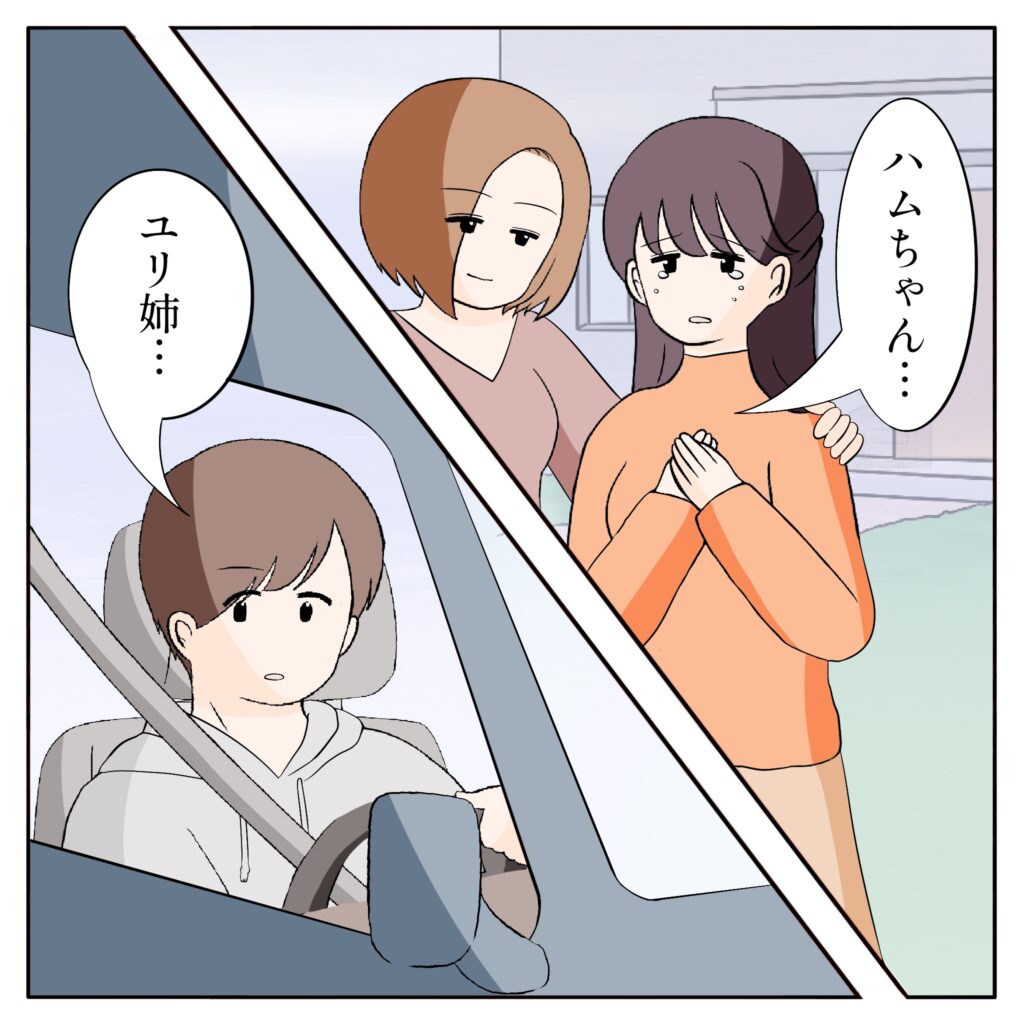 姉ちゃんは、家の中からユリ姉を呼んできてくれました。「ハムちゃん・・・」そうつぶやく彼女の目には、うっすらと涙が浮かんでいます。今さら何を話せばいいんだ、俺はもうフラれているのに。そんな思いが頭をよぎりましたが、とりあえずユリ姉を車へと迎え入れました。