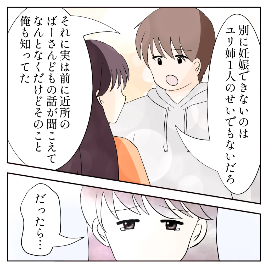 「別に妊娠できないのはユリ姉1人のせいでもないだろ。それに、実は前に近所のばーさんどもの話が聞こえて、なんとなくだけどそのこと俺も知ってた」そう言うと、「だったら・・・」と目に涙を浮かべるユリ姉。