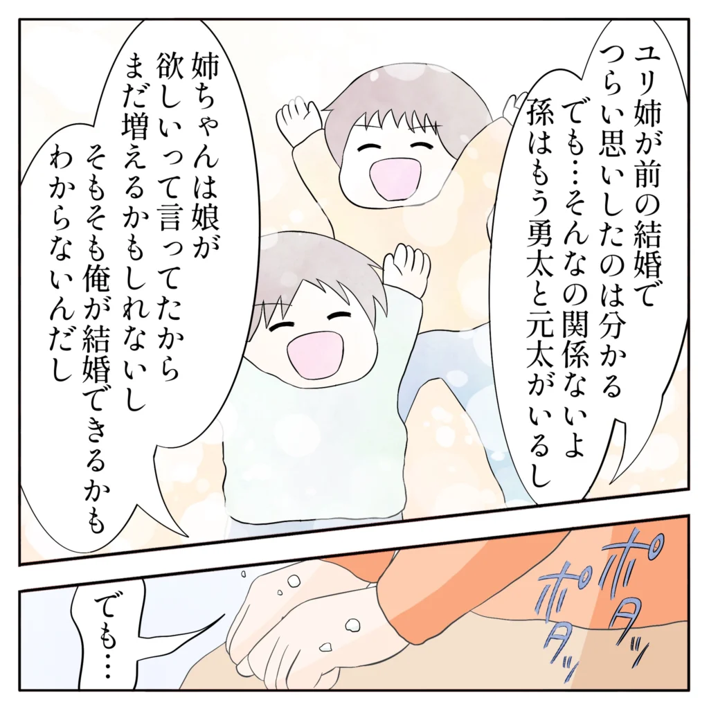 「ユリ姉が前の結婚でつらい思いしたのは分かる。でも・・そんなの関係ないよ。孫はもう勇太と元太がいるし、姉ちゃんは娘が欲しいって言ってたからまだ増えるかもしれないし。そもそも俺が結婚できるかもわからないんだし」俺の言葉を聞いて涙を流しながら「でも・・」と躊躇するユリ姉に俺は、