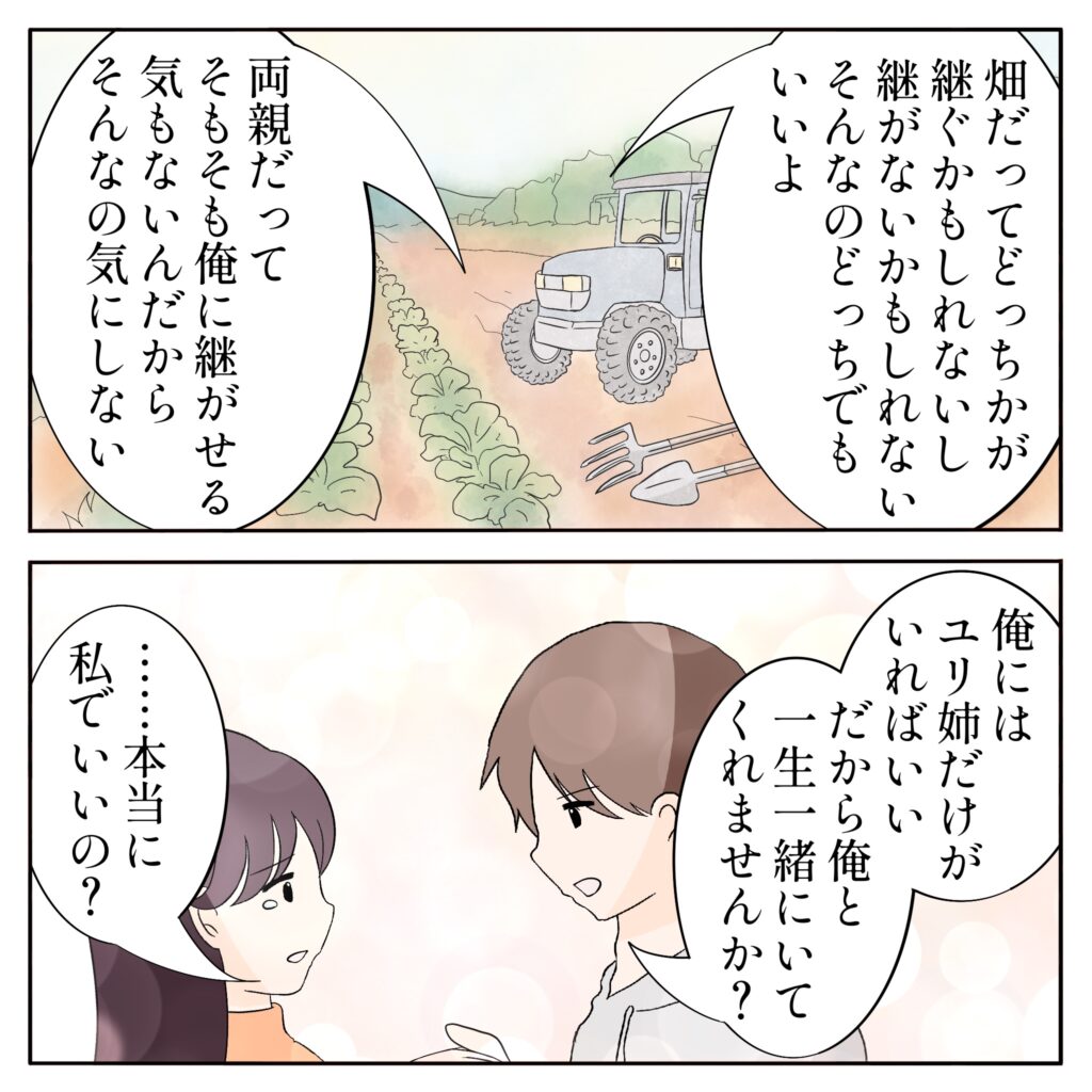 「畑だって、どっちかが継ぐかもしれないし継がないかもしれない。そんなのどっちでもいいよ。両親だって、そもそも俺に継がせる気もないんだから、そんなの気にしない」そう言った後、「俺にはユリ姉だけがいればいい。だから俺と一生一緒にいてくれませんか?」改めてユリ姉にプロポーズすると、ユリ姉は「・・本当に私でいいの?」と戸惑いました。