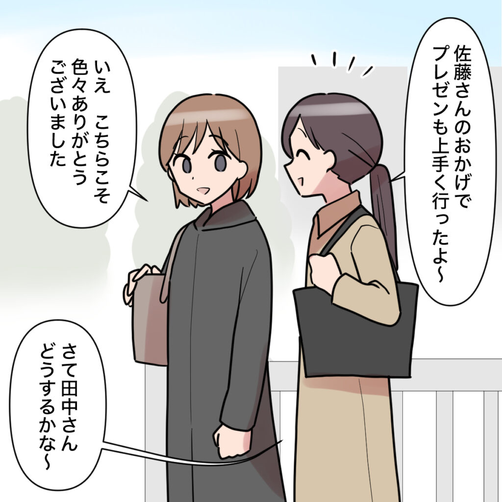 得意先のプレゼンを任されていた田中さんでしたが、当日になって体調不良を理由に欠席。本来なら得意先へ直行するはずだったのに、プレゼンの資料が入ったPCが会社に置いたままになっていたことから、藤澤さんと私は、田中さんが最初からプレゼンを休むつもりだったことを察します。藤澤さんがすぐに電話をくれたおかげで、プレゼンをなんとか成功させることができました。