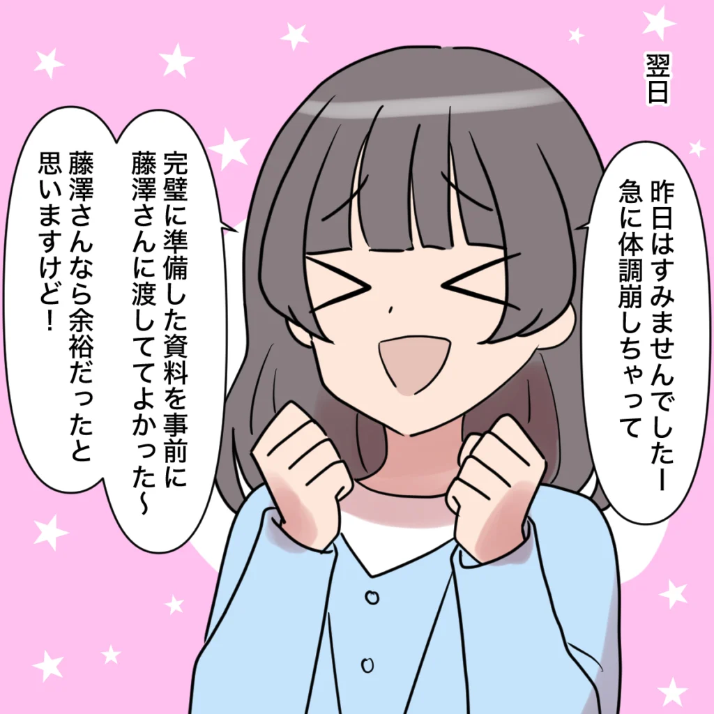 翌日、田中さんは何事もなかったかのように出社してきました。「昨日はすみませんでしたー急に体調崩しちゃって」と、あまりにも軽い謝罪に思わず頭を抱えてしまいます。田中さんは続けて「完璧に準備した資料を事前に藤澤さんに渡しててよかった~藤澤さんなら余裕だったと思いますけど!」と悪びれる様子なく言いました。
