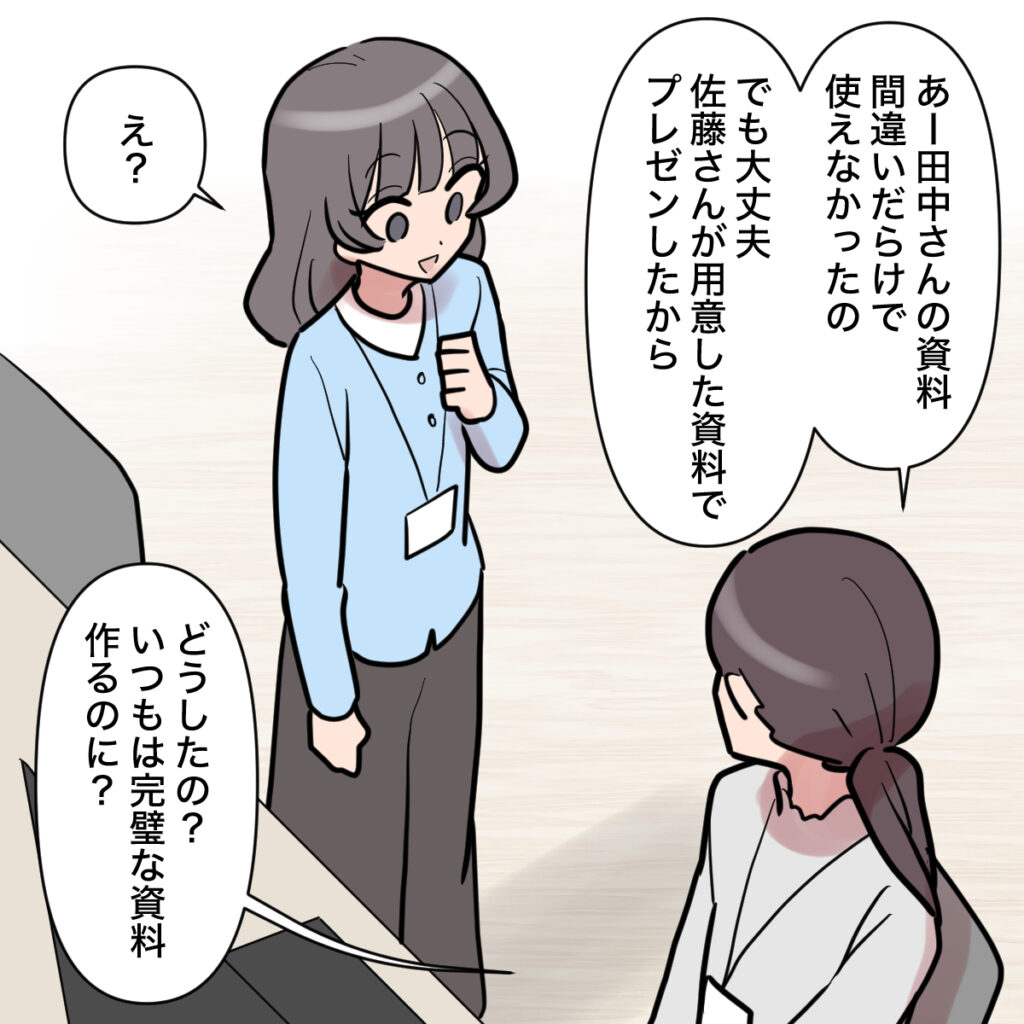 すると藤澤さんは「田中さんの資料間違いだらけで使えなかったの、でも大丈夫、佐藤さんが用意した資料でプレゼンしたから・・・どうしたの?いつもは完璧な資料作るのに」と言いました。穏やかで優しい藤澤さんから、まさかそんな言葉が返ってくるとは思っていなかったのでしょう。田中さんは「え?」とその場で固まってしまいました。