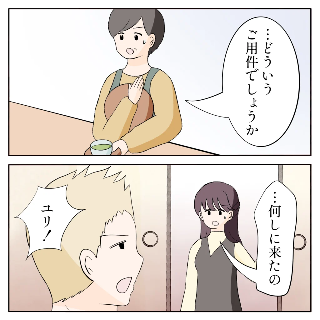 ユリを訪ねてきたのは元夫でした。戸惑いつつも男性を客間に通した母さん。お茶を出しながら「・・どういうご用件でしょうか」と尋ねていると、ユリがやってきて「・・何しに来たの?」と元夫に声をかけました。