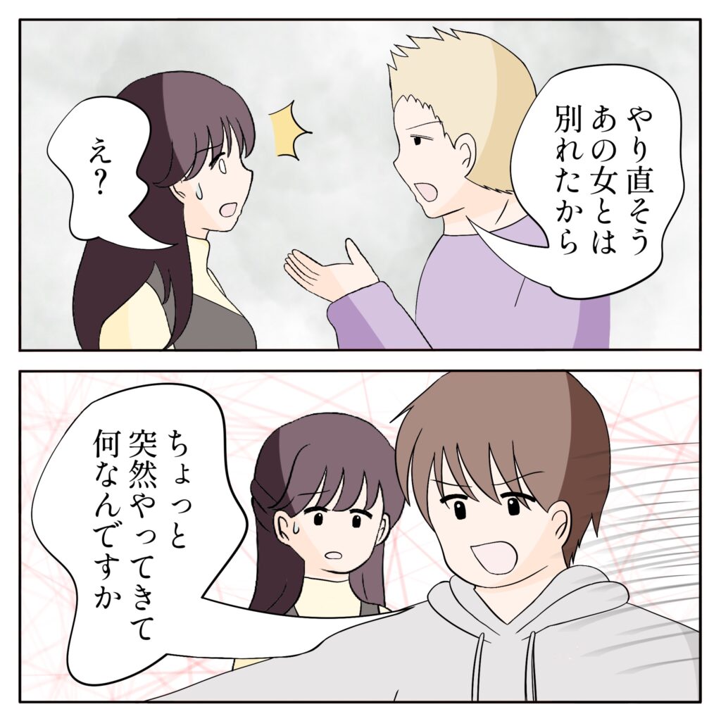 元夫はユリを見るや否や「やり直そう。あの女とは別れたから」と言い寄り、ユリはとても困惑していました。怯えた様子のユリを守るように俺は二人の間に入り「ちょっと、突然やってきて何なんですか」と元夫に詰め寄りました。