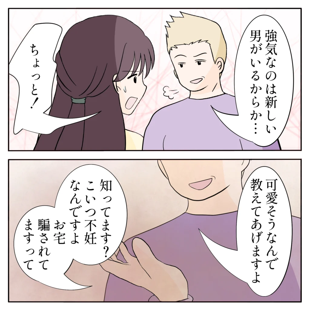 「強気なのは新しい男がいるからか・・」と小ばかにしたように言う元夫に「ちょっと!」とユリが声を荒げると、元夫は「かわいそうなんで教えてあげますよ」とニヤニヤしながら「知ってます?こいつ不妊なんですよ。お宅騙されてますって」と俺に話しかけてきました。